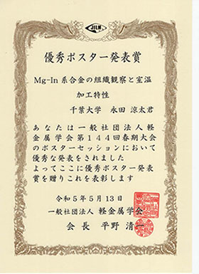 永田涼太,戸村好貴,疋田達哉,糸井貴臣:“Mg-In系合金の組織観察と室温加工特性”